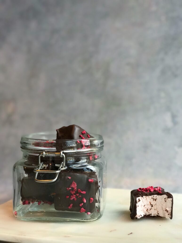 Jeg elsker skumfiduser i alle afskygninger. Skumfiduser med smag af banan, jordbær eller neutral og med eller uden chokolade. Denne her version er med kirsebær smag og overtrukket med chokolade. Du kan både udelade kirsebær og chokolade, så får du en mere neutral skumfidus og du kan selvfølgelig også tilføre andre smage efter ønske. Det er ikke så svært at lave skumfiduser, du skal bare have et sukkertermometer og gerne en røremaskine.